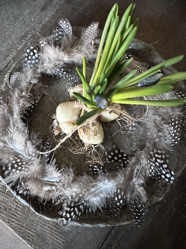 Decoratief parelhoen veren kransje. 16 cm